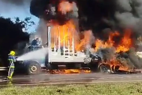 Caminhão com carga de pneus pega fogo e interdita BR-467 em Cascavel