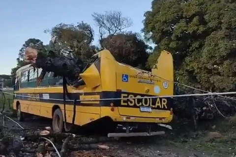 Araucária cai em ônibus escolar estacionado e destrói parte do veículo, em Ipiranga