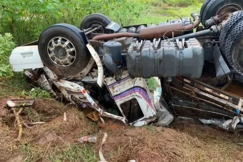 Motorista sai ileso após caminhão carregado tombar e ter cabine esmagada no PR