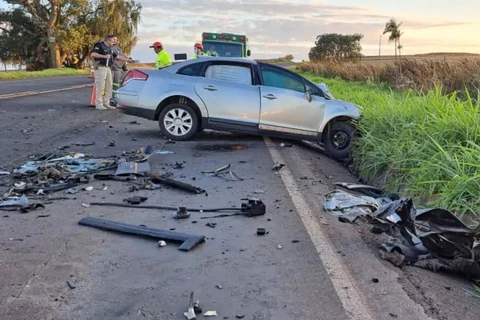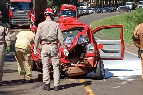Carro fica irreconhecível ao atingir motorhome em acidente; uma pessoa morreu