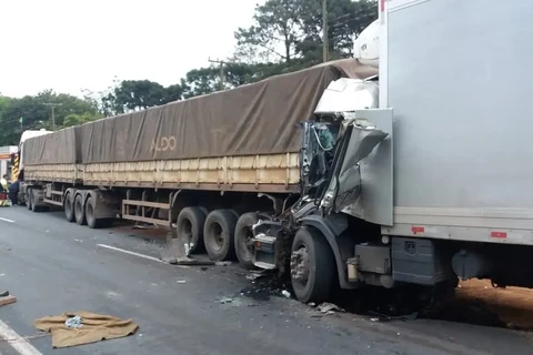 Motorista fica preso às ferragens e é socorrido em estado grave após batida entre dois caminhões, em Ponta Grossa