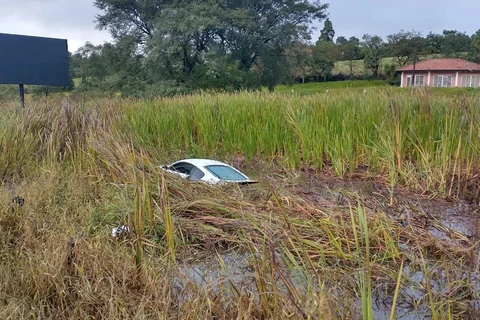 Motorista perde controle da direção, sai da pista e mergulha carro de luxo em terreno alagado, na BR-376