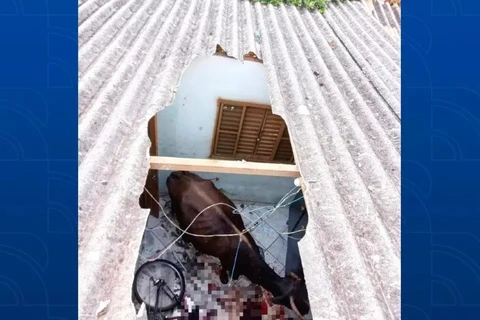 Após porca, cabra e cavalo caírem no telhado de casa, família é surpreendida por vaca