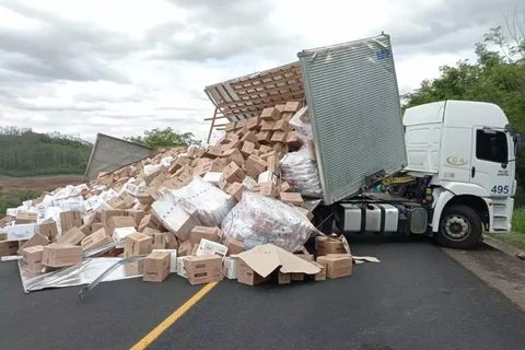 PR-445 segue interditada após carreta com ração e filtro de café tombar na pista