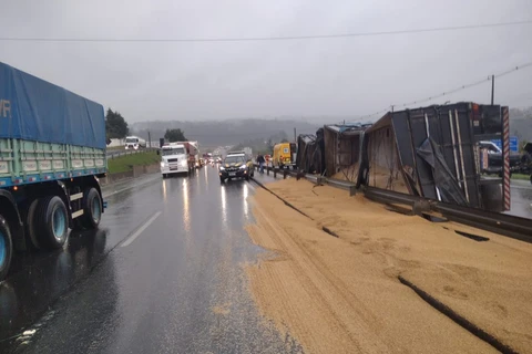 Caminhão tomba e espalha carga de malte na BR-376, em Ponta Grossa