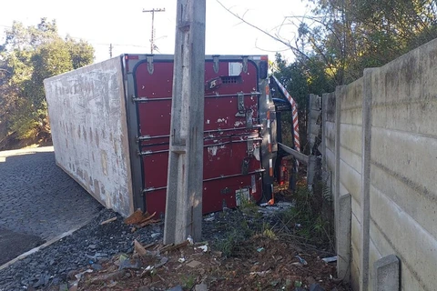 Caminhão frigorífico não vence subida e acaba tombando após bater em muro, em Ponta Grossa