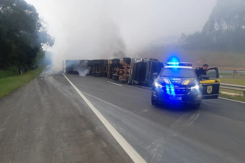 PRF atende tombamento de caminhão com princípio de incêndio