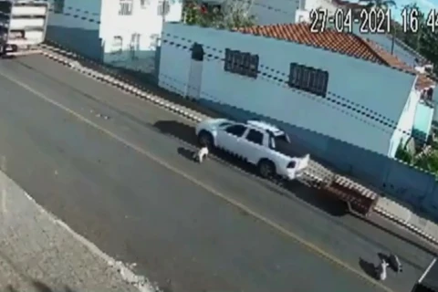 Porta traseira de caminhão em movimento abre, e porcos caem no meio da rua, em Piraí do Sul
