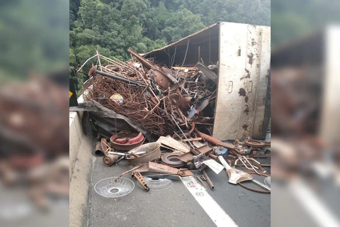 Caminhão carregado com sucata tomba, e duas pessoas ficam feridas na BR-277