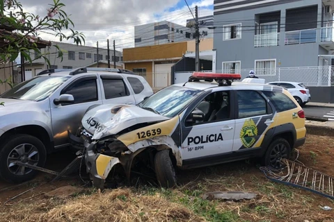Carro da PM bate em veículo estacionado em quintal após acidente, no Paraná