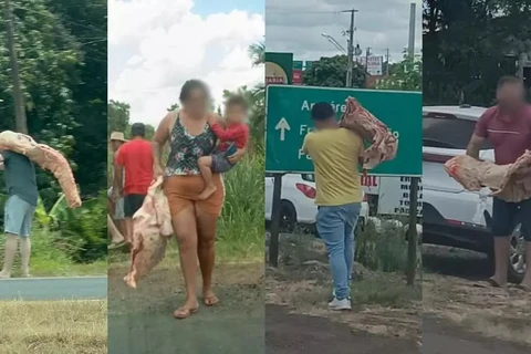 Pessoas ‘abraçam’ carne e furtam 5 toneladas após tombamento