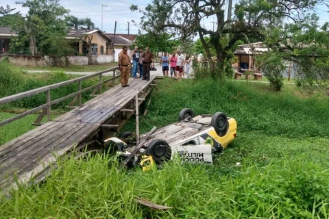 Viatura da PM cai em rio durante acompanhamento tático a motoqueiro em fuga