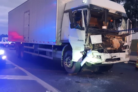 Motorista fica ferida em colisão traseira entre dois caminhões