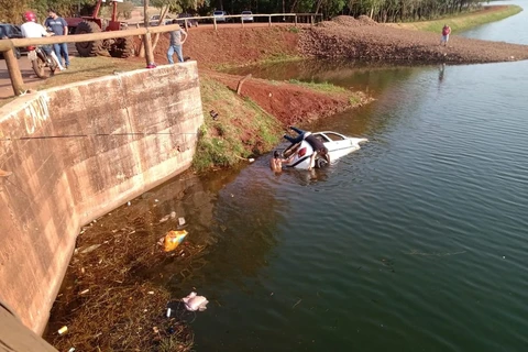 Carro cai em represa depois de acidente, e jovens conseguem sair do veículo para pedir ajuda