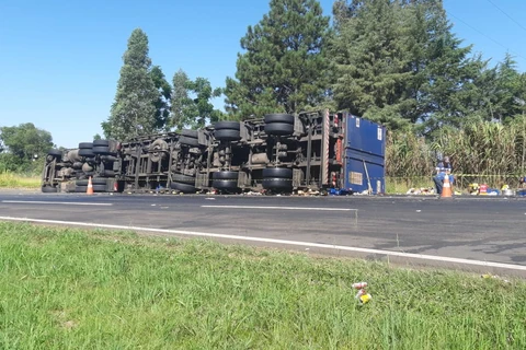 Carreta carregada com garrafas de cerveja tomba na BR-373