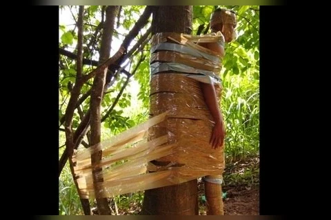 Jovem é encontrado amarrado em árvore com fita adesiva dos pés à cabeça