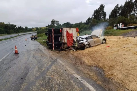 Passageira morre após carro bater em caminhão tombado na pista na BR-376