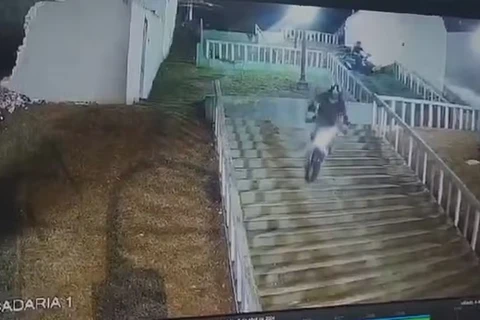Suspeito desce escadaria de moto e colide contra carro ao tentar fugir da Guarda Municipal