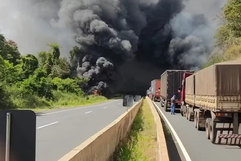 BR-376 é bloqueada no sentido sul em Tibagi após caminhão carregado de óleo diesel tombar e pegar fogo