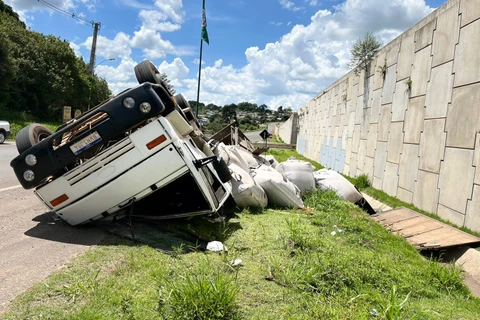 Caminhão tomba em alça de acesso do viaduto das Brotas, em Piraí do Sul