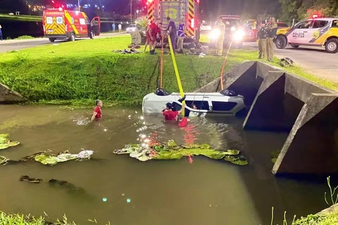 Carro cai de ponte, fica submerso e duas pessoas morrem em lago de parque, em Castro