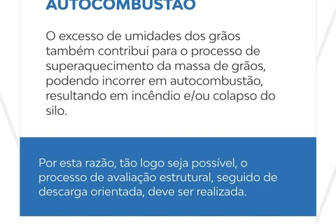 O excesso de umidades dos grãos também contribui para o processo de superaquecimento da massa de grãos, podendo incorrer em autocombustão, resultando em incêndio e/ou colapso do silo. Por esta razão, tão logo seja possível, o processo de avaliação estrutural, seguido de descarga orientada, deve ser realizada.