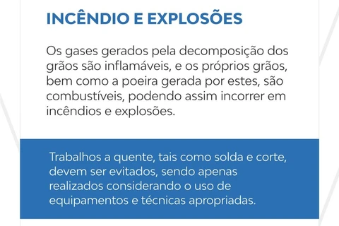 Os gases gerados pela decomposição dos grãos são inflamáveis, e os próprios grãos, bem como a poeira gerada por estes, são combustíveis, podendo assim incorrer em incêndios e explosões. Trabalhos a quente, tais como solda e corte, devem ser evitados, sendo apenas realizados considerando o uso de equipamentos e técnicas apropriadas.