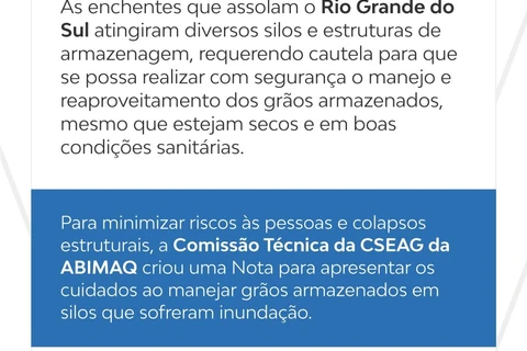 Visando evitar a desinformação e minimizar os riscos que podem decorrer de colapsos estruturais, a Comissão Técnica da Câmara Setorial de Armazenagem de Grãos (CSEAG) da Associação Brasileira da Indústria de Máquinas e Equipamentos (ABIMAQ) apresenta a seguir precauções que devem ser consideradas ao manejar grãos armazenados em silos que foram inundados: