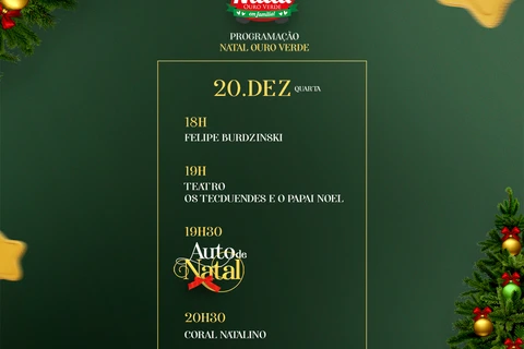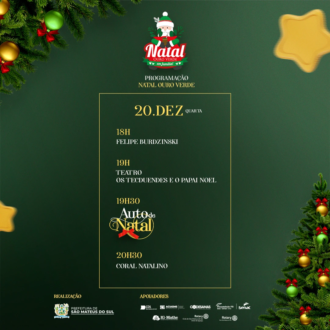 COM ASSESSORIAS - Nesta quarta-feira (20), a programação de Natal continua em São Mateus do Sul. As atrações começam às 18h com apresentação de Felipe Burdzinski. Às 19h, a população poderá vivenciar o espetáculo teatral "Os Tecduendes e o Papai Noel".