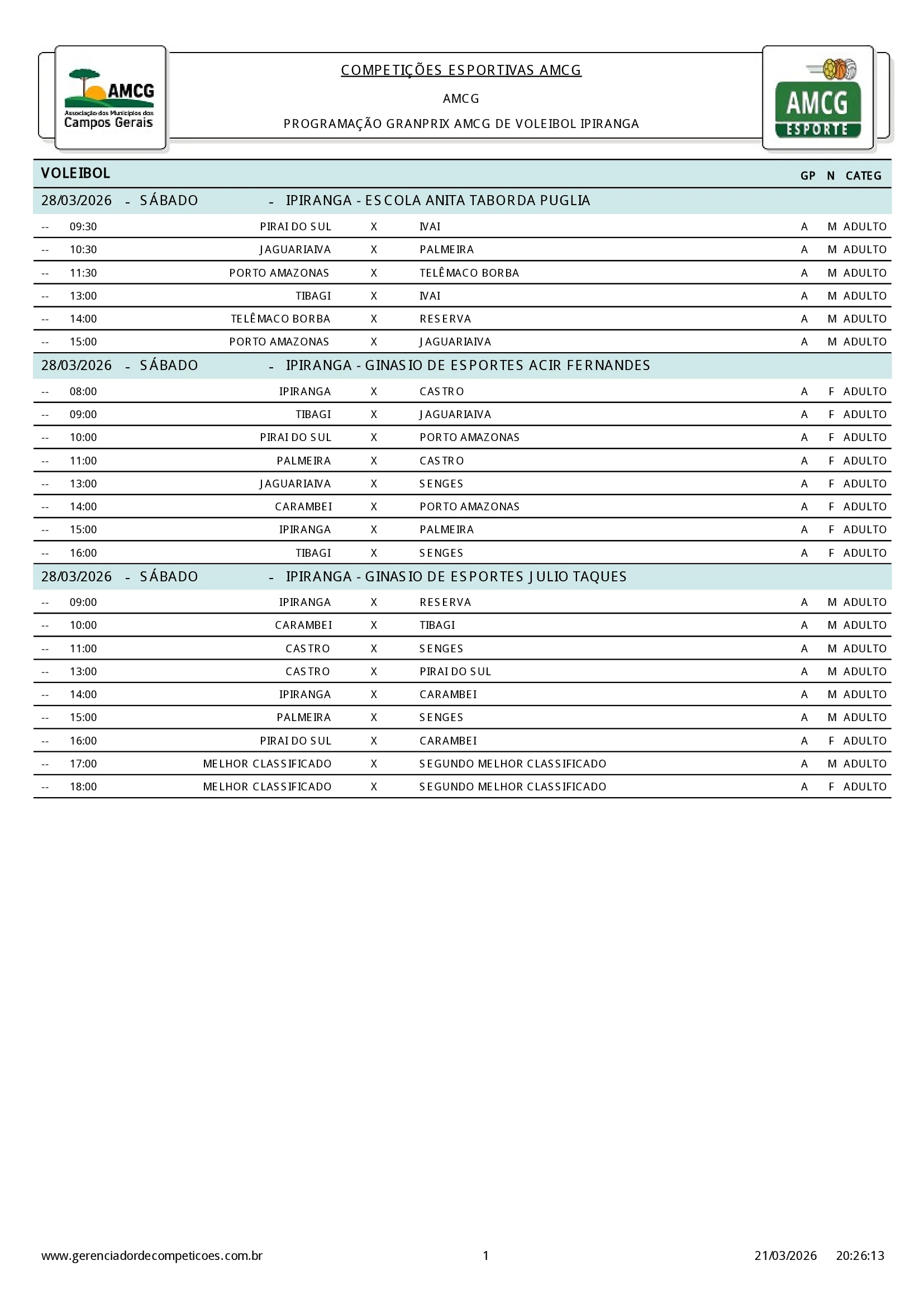 A programação inicia já nas primeiras horas da manhã e segue até o início da noite, com uma sequência intensa de confrontos. No feminino, as partidas começam às 8h, com o duelo entre Ipiranga e Castro. Já no masculino, os jogos têm início a partir das 9h, com confrontos como Piraí do Sul x Ivaí e Ipiranga x Reserva.