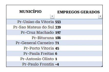 A divulgação mostra que São Mateus do Sul gerou 339 empregos em 2023, sendo o segundo município que mais gerou empregos na região, atrás somente de União da Vitória (município mais populoso) que gerou 553 empregos. Confira o ranking abaixo: