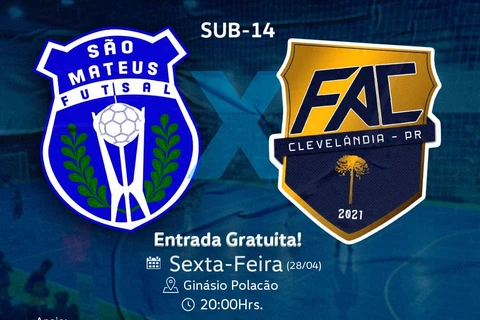 COM ASSESSORIAS - O São Mateus Futsal se prepara para mais um jogo importante pelo Campeonato Paranaense de Futsal, categoria sub-14. Nesta sexta-feira, 28/4, às 20h, a equipe da casa enfrentará o Futsal Atlético Clevelandense no Ginásio Polacão, em uma partida que promete muita emoção e disputa acirrada.