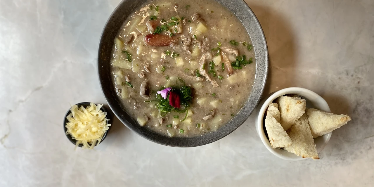 sopa de pinhão: tem Pinhão, Carne Bovina e Batatas, acompanha torradas feitas com pão de fermentação natural e queijo ralado.