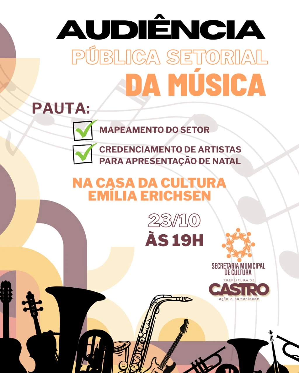 A audiência visa discutir com os agentes culturais do cenário musical de Castro o mapeamento do segmento no âmbito local e as futuras contratações, com foco nas apresentações de Natal, promovidas pela Prefeitura.