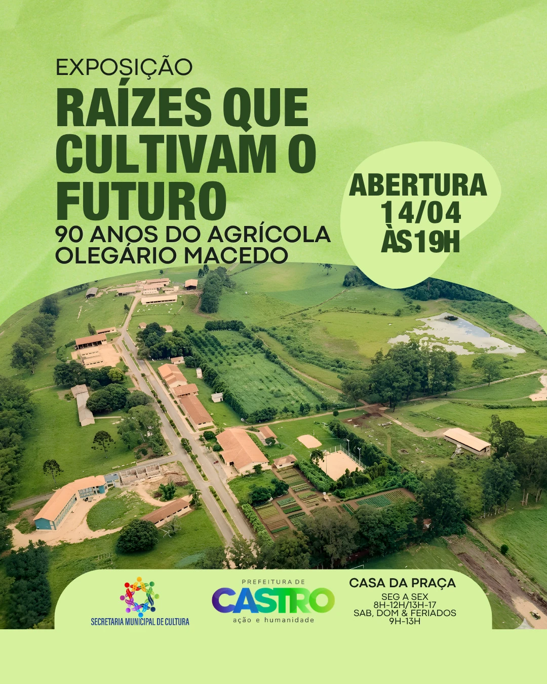 COM ASSESSORIAS - A Secretaria Municipal de Cultura, com apoio da Prefeitura, abre no dia 14 de abril, às 19 h, na Casa da Praça, a exposição “Raízes e Transformações: 90 anos do Colégio Agrícola Olegário de Macedo”. A iniciativa celebra as nove décadas de história da instituição, hoje denominada Centro Estadual de Educação Profissional Olegário Macedo (CEEPOM), referência na formação técnica ligada ao meio rural.