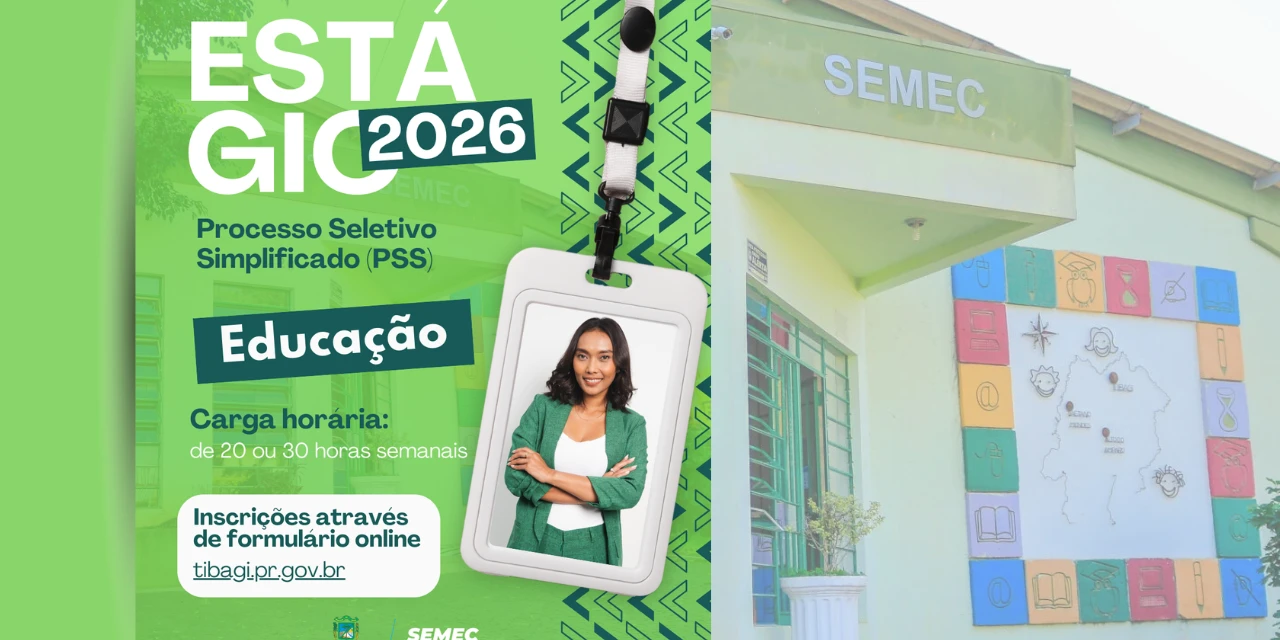COM ASSESSORIAS - A Prefeitura de Tibagi, por meio da Secretaria Municipal de Educação e Cultura, informa que estão abertas as inscrições para o Processo Seletivo Simplificado (PSS) nº 001/2026, para à seleção e formação de cadastro reserva de estagiários para a área da Educação. São mais de 35 vagas em todo o município.