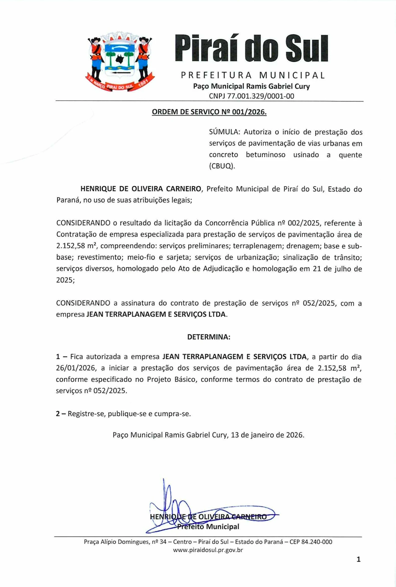 COM ASSESSORIAS - A Prefeitura de Piraí do Sul deu, nesta data, a ordem de serviço para o início da pavimentação em CBUQ da Rua 21 de Abril, localizada no Bairro Benevenuto Dalcol, contemplando um trecho que atualmente não possui nenhum tipo de pavimentação. A obra será executada entre a Rua João Sguario e a ponte, atendendo a uma antiga demanda da comunidade e promovendo mais segurança e mobilidade para motoristas e pedestres.