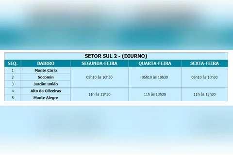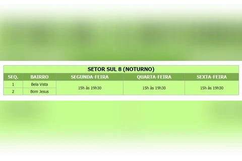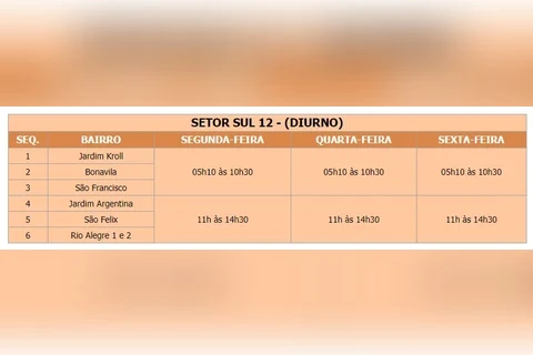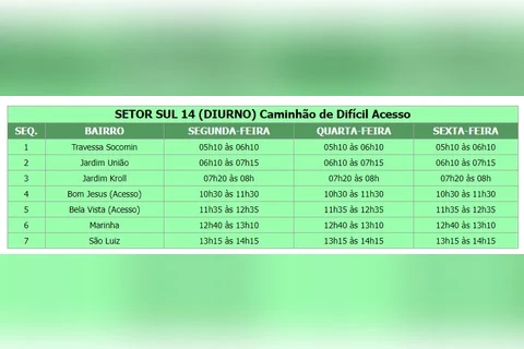 O divisor de coletas será a PR 160. Observando o sentido Triângulo – Harmonia, os bairros localizados ao lado direito da rodovia serão coletados na segunda, quarta e sexta-feira. Os bairros localizados ao lado esquerdo da Rodovia, serão coletados na terça, quinta e sábado.