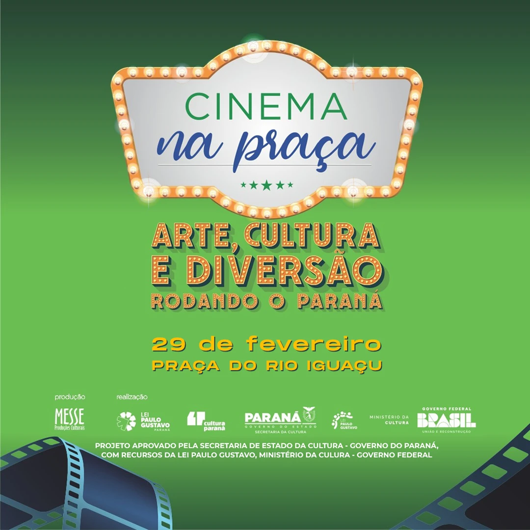 COM ASSESSORIAS - O projeto Cinema na Praça, realizado pela Secretaria de Estado de Cultura e produzido pela Messe Produções Culturais, passará por São Mateus do Sul na próxima quinta-feira (29). Serão exibidos dois filmes nacionais a partir das 19h, na Praça do Rio Iguaçu. Confira o cronograma abaixo: