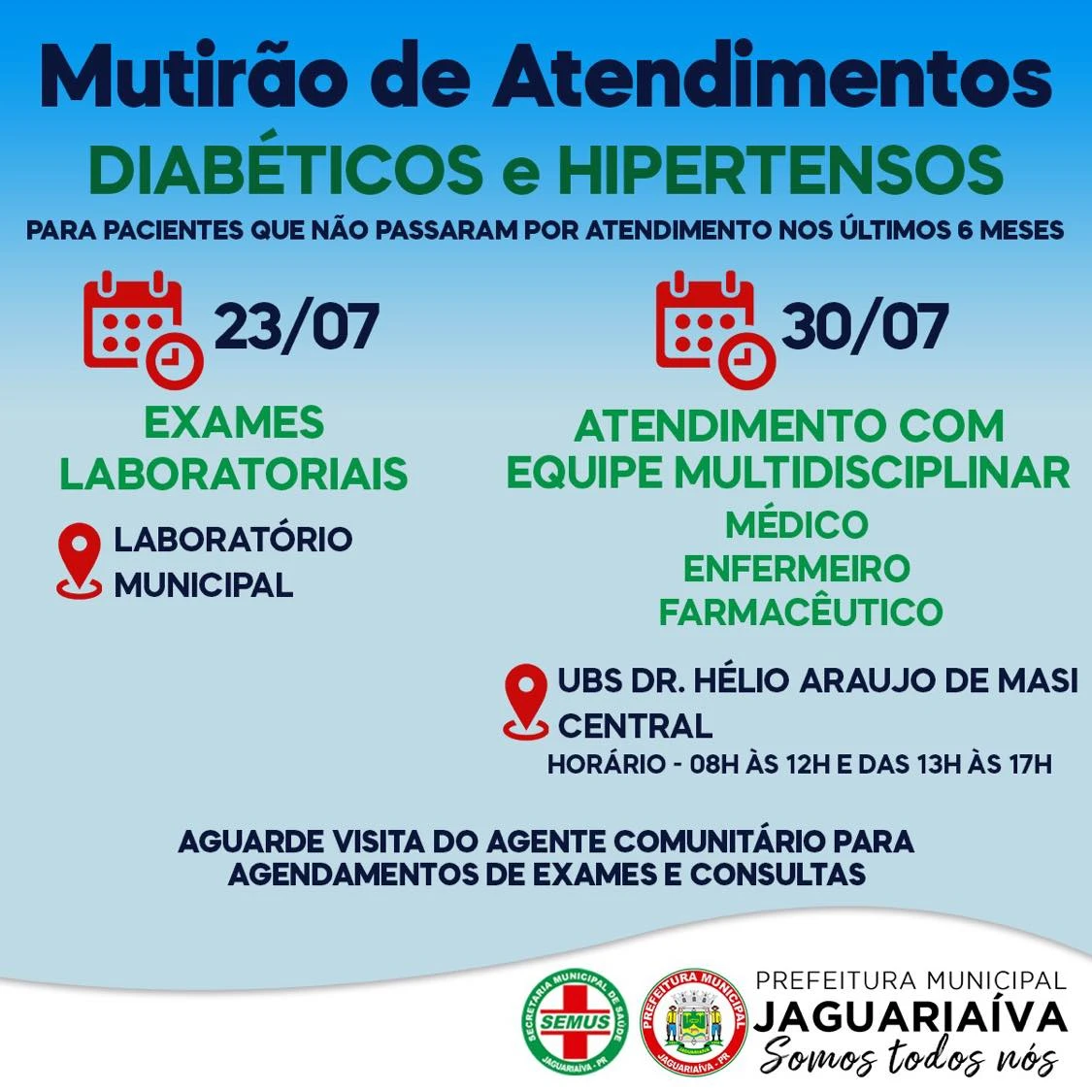 Mutirão - Já com o resultado, no dia 30, das 8h às 12h, e das 13h às 17h, será a hora de diabéticos e hipertensos passarem por consulta médica, revisão de tratamento, aferição de pressão, estratificação de risco e outros procedimentos com equipe multidisciplinar. O mutirão será na UBS Central (Dr. Hélio Araújo de Masi), exclusivo para os diabéticos e hipertensos convocados, ou seja, aqueles que não buscaram atendimento de saúde há mais de seis meses, realizaram previamente o exame no dia 23 e tiveram as consultas agendadas para este dia. Mais informações sobre a ação podem ser obtidas na UBS mais próxima.