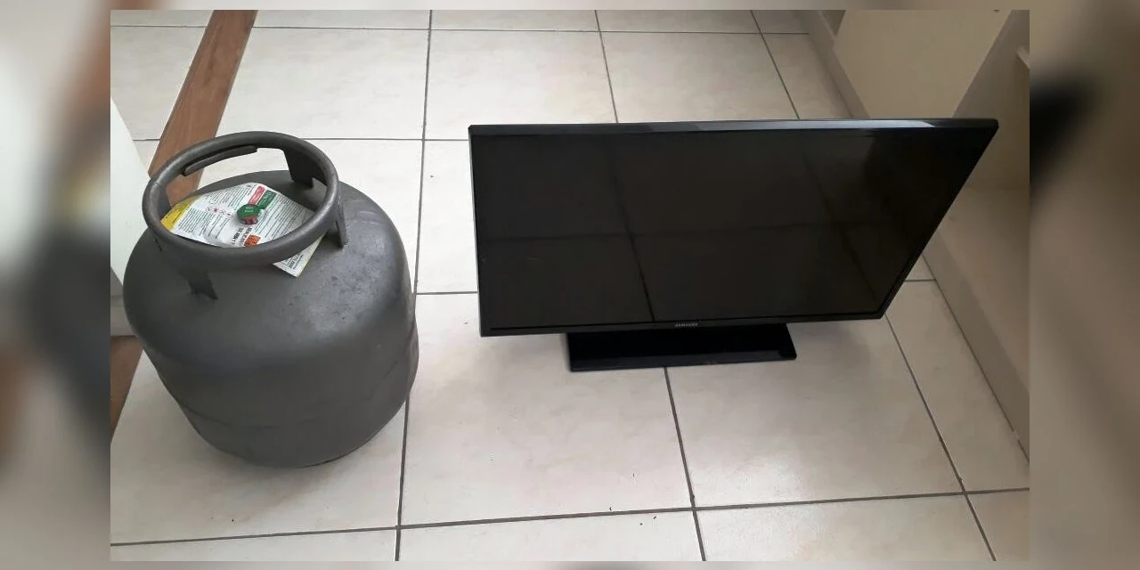 Após amarrar a vítima com faixas de tecido, roubou do imóvel alguns pertences, dentre eles um aparelho televisor e um botijão de gás.