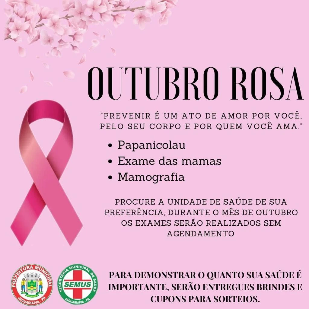 Durante o Outubro Rosa exames papaniclolau, mamas e mamografia serão feitos sem agendamento durante a semana, em qualquer UBS (Unidade Básica de Saúde), inclusive com atendimento até 21h nas UBS’s Dr. Hélio Araújo de Masi (Central) e Dr. Domingos Cunha (Santa Cecília).