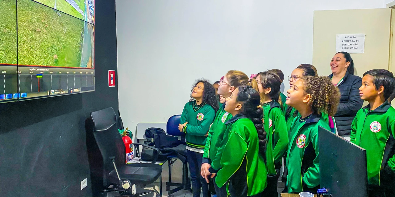 As turmas são de 4º ano. Elas são recebidas pelo diretor do DESP, Dirceu Moura Jorge, e equipe, que apresentam como as câmeras são instaladas estrategicamente em prédios públicos e ruas para garantir a vigilância 24 horas.