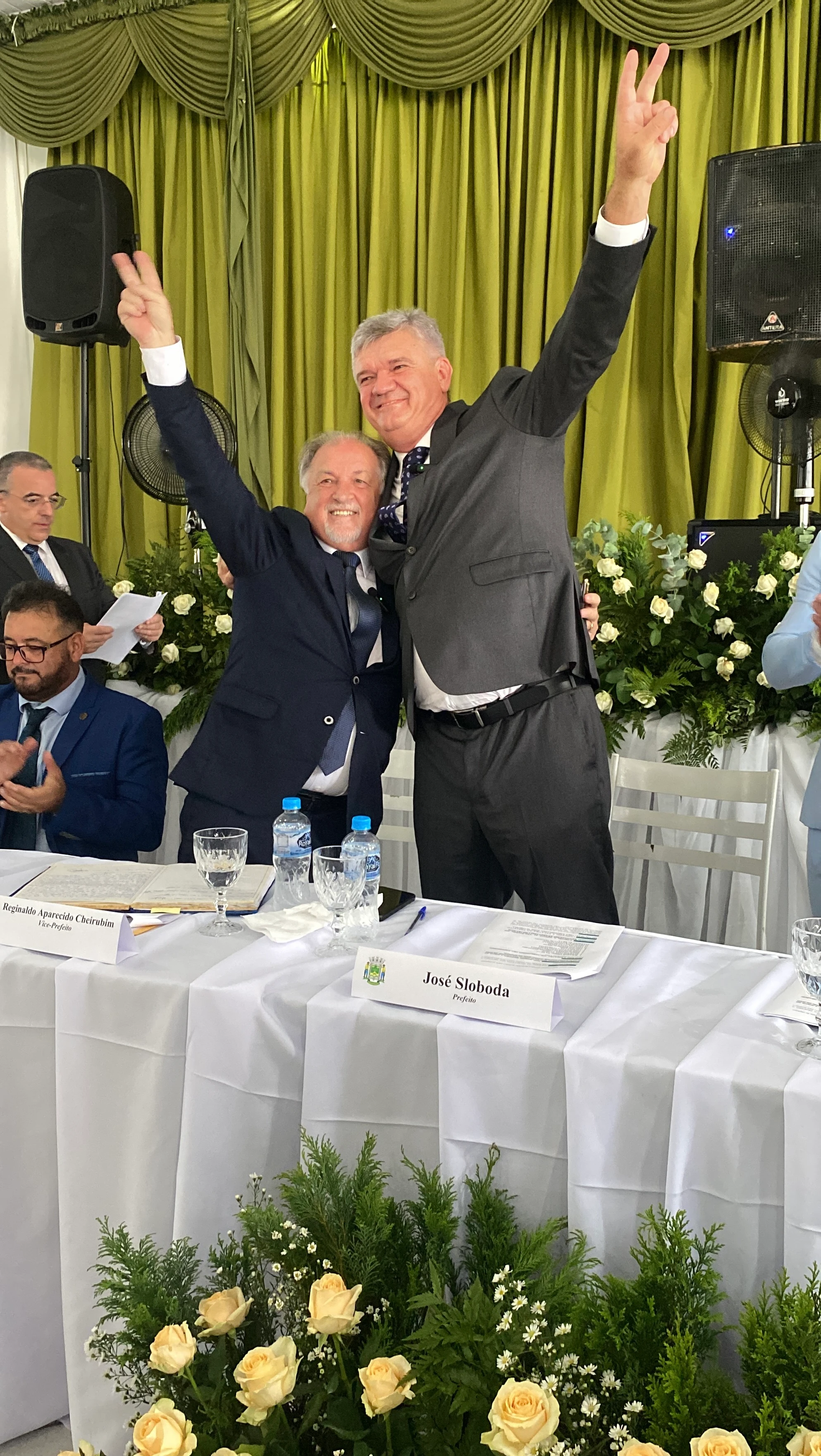 COM ASSESSORIAS - Neste dia 1° de janeiro ocorreu no Clube Recreativo Municipal a sessão solene de posse do prefeito José Sloboda e do vice-prefeito Reginaldo Cheirubim. O ato oficial contou com a presença de autoridades, familiares, amigos, apoiadores e membros da comunidade.