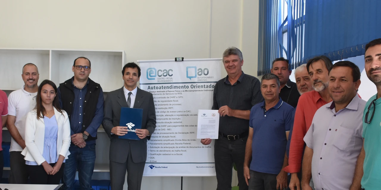 Prefeito José Sloboda, chefe da regional da Receita Federal, Demetrius de Moura Soares, vereadores e funcionários que atuarão no ponto de autoatendimento do órgão em Jaguariaíva.