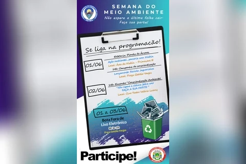 No dia 2, às 14h, encontro de conscientização ambiental “Não espere a última folha cair, faça a sua parte”, no Cine Teatro Valéria Luercy. E de 1º a 3 de junho, das 8h às 17h, na Praça Getúlio Vargas, o “Bota Fora de Lixo Eletrônico”, onde poderão ser entregues som, vídeo game, aquecedores, ar condicionado, baterias de celular, carregadores, celular, entre outros.