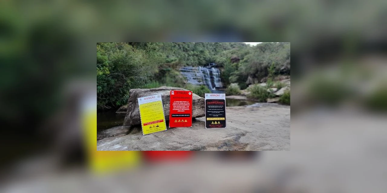 A sinalização dispõe sobre locais com perigo de afogamento, necessidade de equipamentos de segurança e guia especializado, proibição de acampamentos, fogueiras e consumo de alimentos e bebidas.