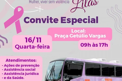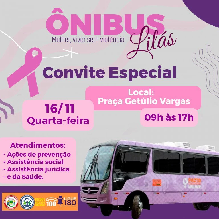 O Ônibus Lilás estará na Praça Getúlio Vargas, das 9h às 17h, com atendimentos individuais e sigilosos de assistência social e jurídica, testes rápidos de saúde, mais ações de orientação e prevenção, como uma palestra sobre a Lei Maria da Penha. Equipe do município vai prestar os serviços. Em continuidade à campanha, no dia 25, marcando o Dia Internacional da Não-Violência contra a Mulher, a Administração Municipal, via SHADS e CREAS, promove uma apresentação teatral temática, no Cine Teatro Valéria Luercy, às 14 horas, com entrada livre.