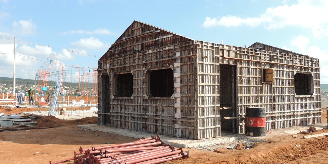 Estruturadas com ferro para receber concreto fresco, as paredes das casas neste loteamento estão sendo feitas sob as superfícies dos radiers. Estes são estruturas de base, feitas de concreto armado em contato direto com o terreno. O sistema também já recebe tubulações para instalações como as hidrossanitárias, dando mais agilidade à construção.