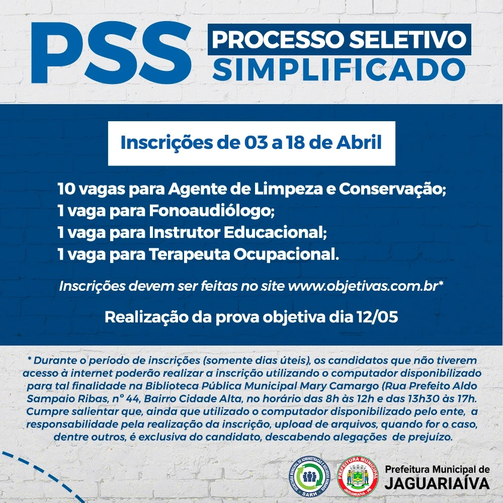 COM ASSESSORIAS - A Prefeitura Municipal de Jaguariaíva publicou edital para a realização de um processo seletivo simplificado (PSS) que visa preencher temporariamente vagas em quatro áreas de atuação.